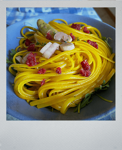 Quando la pasta è cotta e bella gialla, e l’acqua che avete aggiunto si sarà assorbita la pasta è pronta!